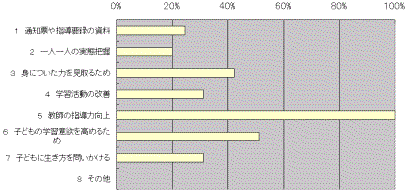 身に付いた力を見取るためと子どもの学習意欲を高めるためという2つの回答が断然多く、70%近く占めていた。総合的な学習の時間の大きなねらいである主体的に学ぶ力を育てていくためには、ほとんどの教師が子どもの学習意欲を高め、身に付いた力を見取ることが重要であると考えている。しかしそれに対して、どのように問題解決力や生きる力を身につけていくかという指導方法についての認識が全体的に低いのではないだろうか。例えば、教師の指導力向上が10%足らずだった。設問【2】において、指導方法についての課題が70%近くあった結果に照らし合わせると、意外な結果ではなか