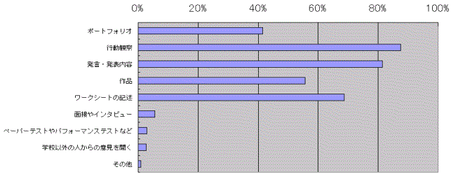 行動観察が最も多く、90%近くを占めた。次に発言・発表内容が80%余り、ワークシートの記述が70%近くを占めた。設問【6】の結果と照らし合わせてみると、総合的な学習の時間において教師は、問題解決力や生きる力を評価することが求められるために、当然ペーパーテストで評価することはほとんどなく、このような評価方法の結果になったと考えられる。