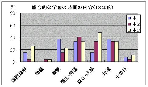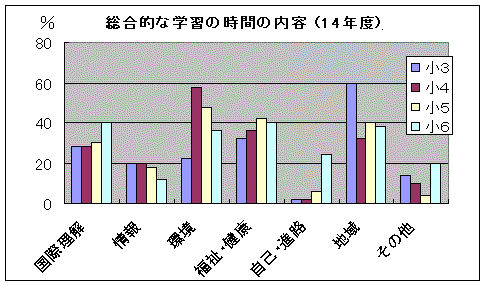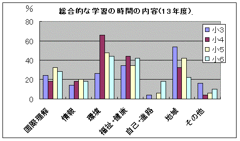 平成13年度と14年度の学習活動の内容を比較すると小学校・中学校とも自己や進路についての内容が増えているのがわかる。これは、発達段階を考慮するとともに児童生徒個々の課題を重視し、自分自身の興味関心と将来を考えたテーマの設定が増えているからであろう。