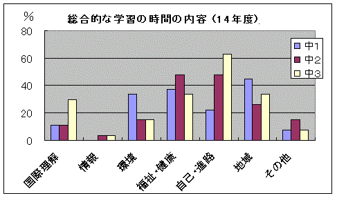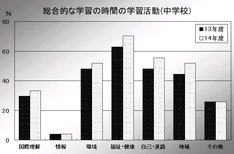 中学校では福祉・健康や環境が60〜70%と多い。また、自己を見つめるための活動や進路についてが小学校と比べ多く、学年があがるに従って増えている。グラフを見ると情報が少ないが、実際は探究活動・調査活動の道具として情報機器が活用されているようである。