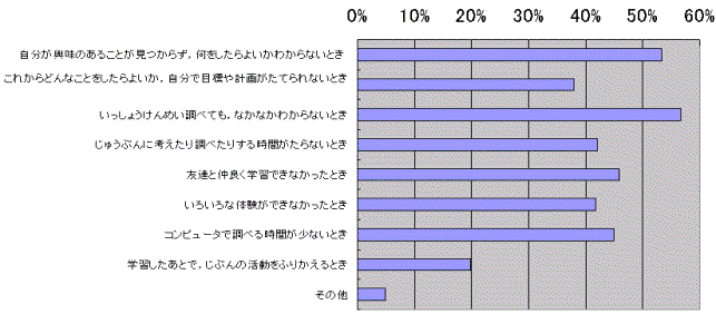 いっしょうけんめい調べても、なかなかわからないときと自分が興味のあることが見つからず、何をしたらよいかわからないときが50%以上を占めた。総合的な学習の時間で、あきらめてしまったり何をしたらよいかわからなかったりして、集中して取り組めていない子どもの様子がイメージとして浮かぶ。それに対して、じゅうぶんに考えたり調べたりする時間がたらないときやいろいろな体験ができなかったとき、コンピュータで調べる時間が少ないときなどは、主体的に学んでいる子どもの姿がイメージできる。総合的な学習の時間では、この2つのイメージのように、子どもの活動が大きく2つに分かれてしまう傾向があるように思う。それはやはり、総合的な学習の時間が子どもの主体的な学びを重視しているからだろう。