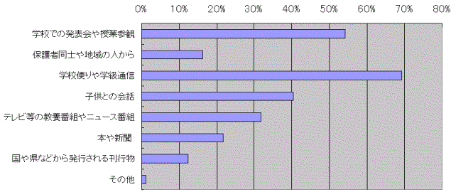 結果から明らかなように、学校からの通信や学校での発表会や授業参観など身近な手段による情報伝達が最も効果的である。それに反して、国や県からの刊行物などの情報は、保護者にとっては関心が低いようである。やはり、自分の子どもの姿を直接知ることができるような手段を重視する必要がある。国や県からの刊行物も、学校から通信や行事等で紹介していくなどの工夫が考えられる。